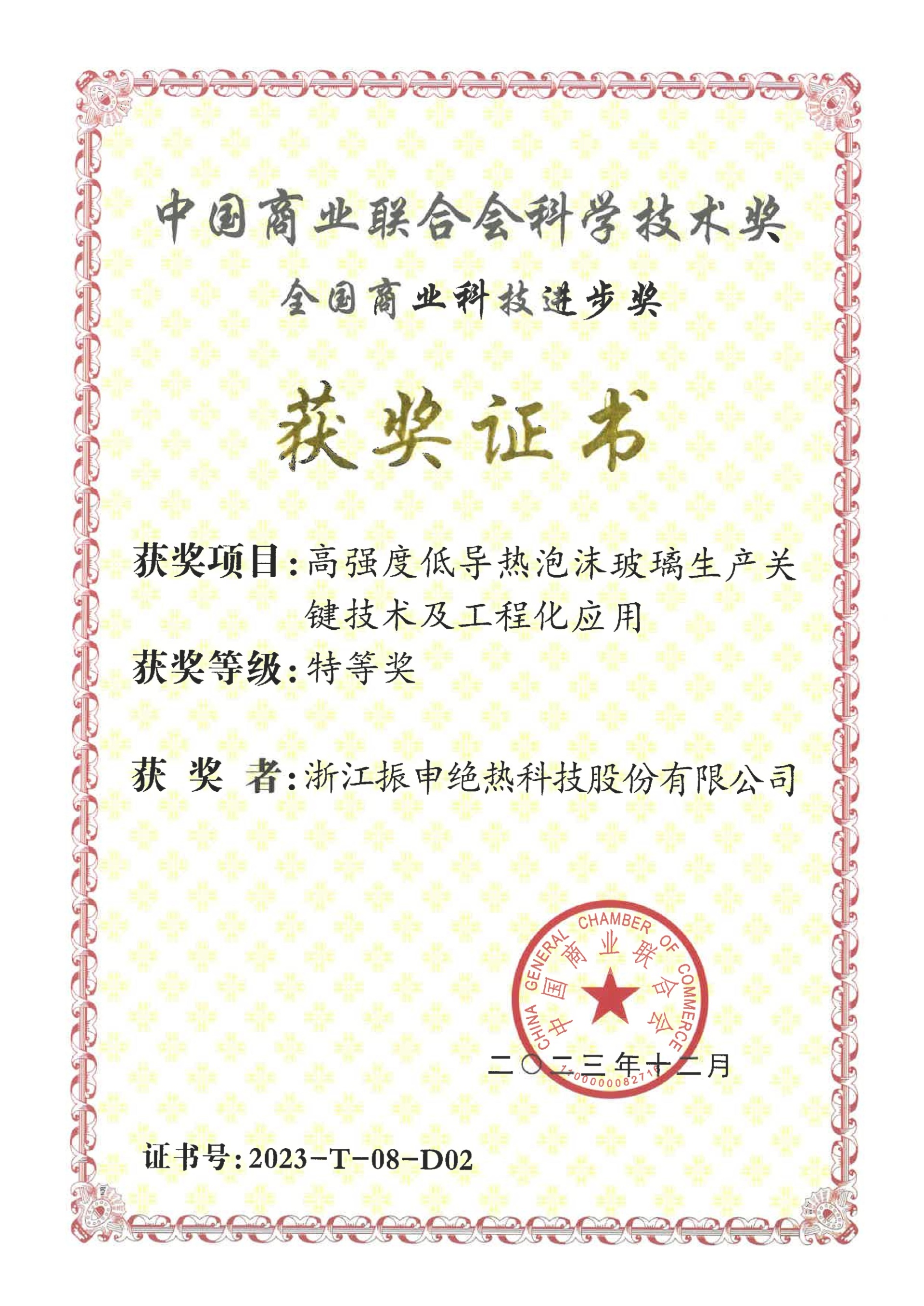近日,由中国商业联合会主办的“2024年全国商业科技质量大会”在北京召开。其中,我公司与浙江理工大学、嘉兴学院、中国地质大学(武汉)、浙江大学共同研究的“高强度低导热泡沫玻璃生产及工程化应用”项目荣获全国商业科技进步奖“特等奖”。
