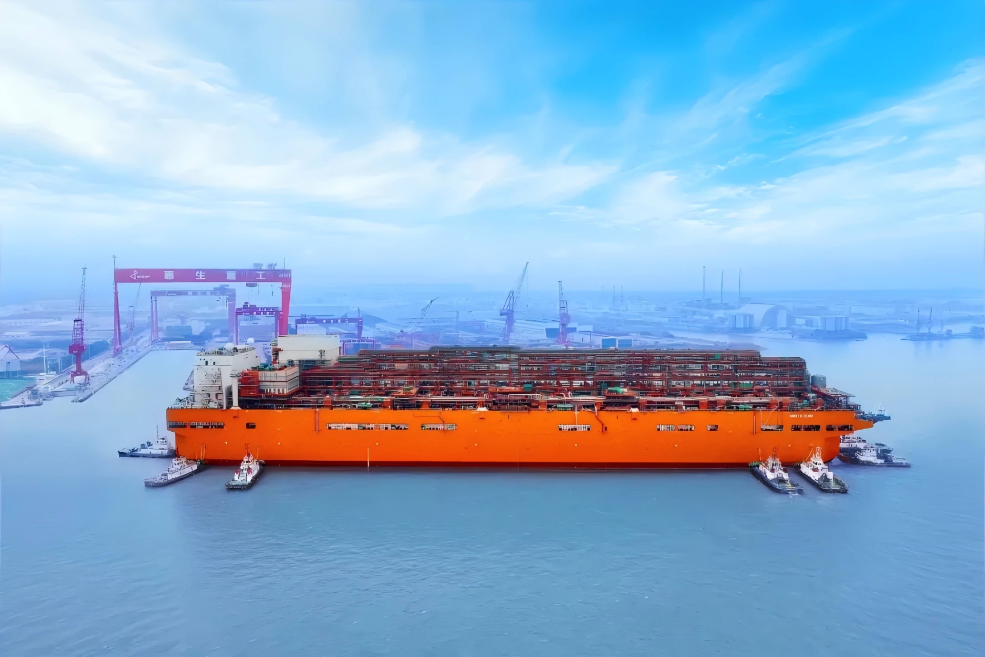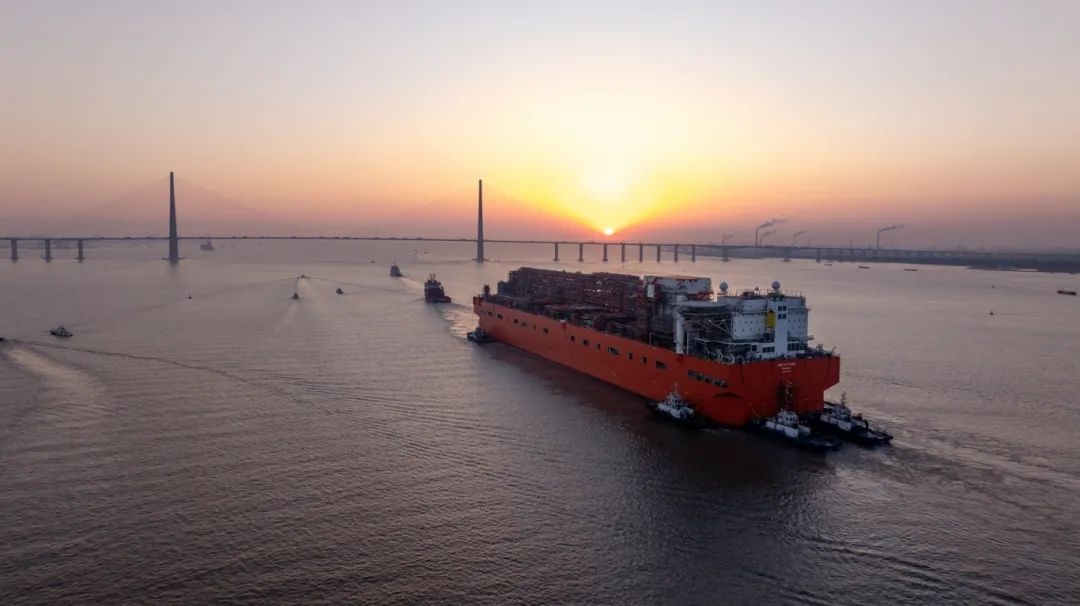 近日,我国首座大型浮式天然气液化装置出江,705米拖带船队长度创长江历史之最。在海事部门10艘海巡艇的接力维护下,由惠生清洁能源建造的我国首座大型浮式天然气液化装置“nguya flng”轮顺利离开长江江苏段,前往舟山船厂码头进行后续舾装作业。