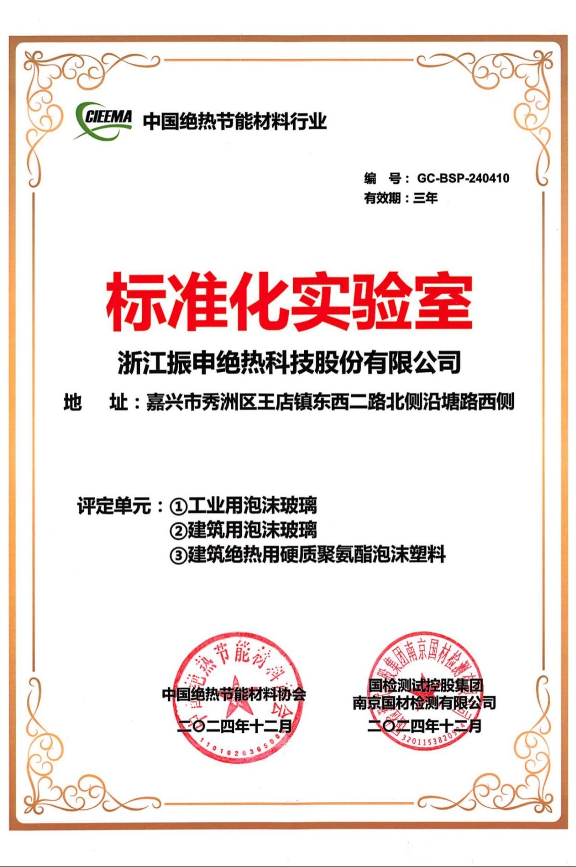 振申绝热荣获全国2024年度绝热材料行业“标准化实验室”资质企业。