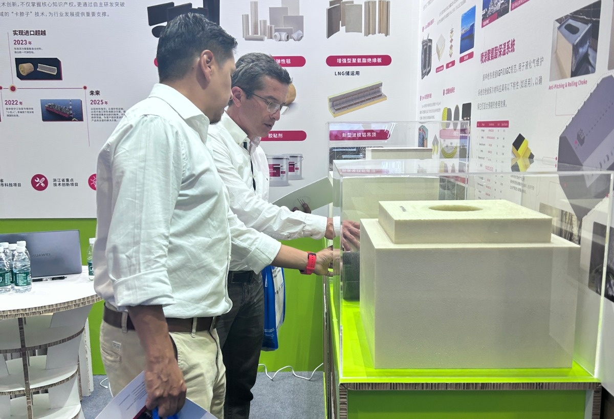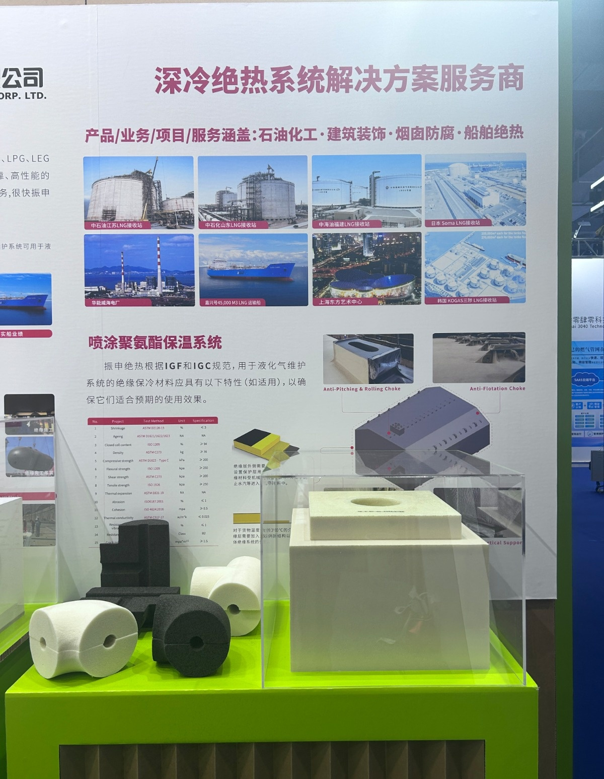 展会现场,振申 b 型舱保冷材料成为焦点。该材料专为 b 型液货舱或燃料舱设计,具备卓越的低温绝热性能与抗冲击性,在 极端环境下,热导率较传统材料大幅降低,保冷效果显著提升,有效减少 低温液体运输过程中的冷能损耗,为能源高效运输保驾护航。